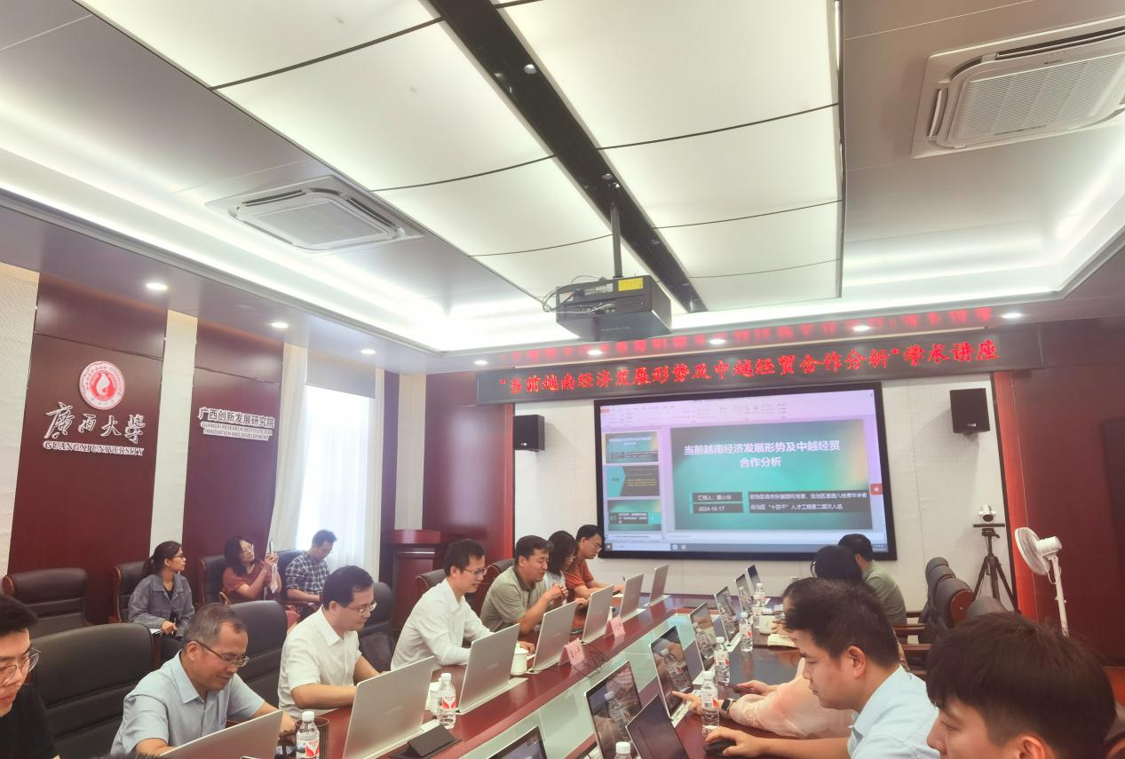 10月17日,为进一步提升我院智库研究能力,探究国别和区域研究新范式,特邀广西社会科学院东南亚研究所副所长雷小华研究员到我院作题为“当前越南经济发展形势及中越经贸合作分析”的学术讲座。本次讲座由李光辉学术院长主持,梁运文执行院长、我院全体智库科研人员以及相关学院教师代表参会。