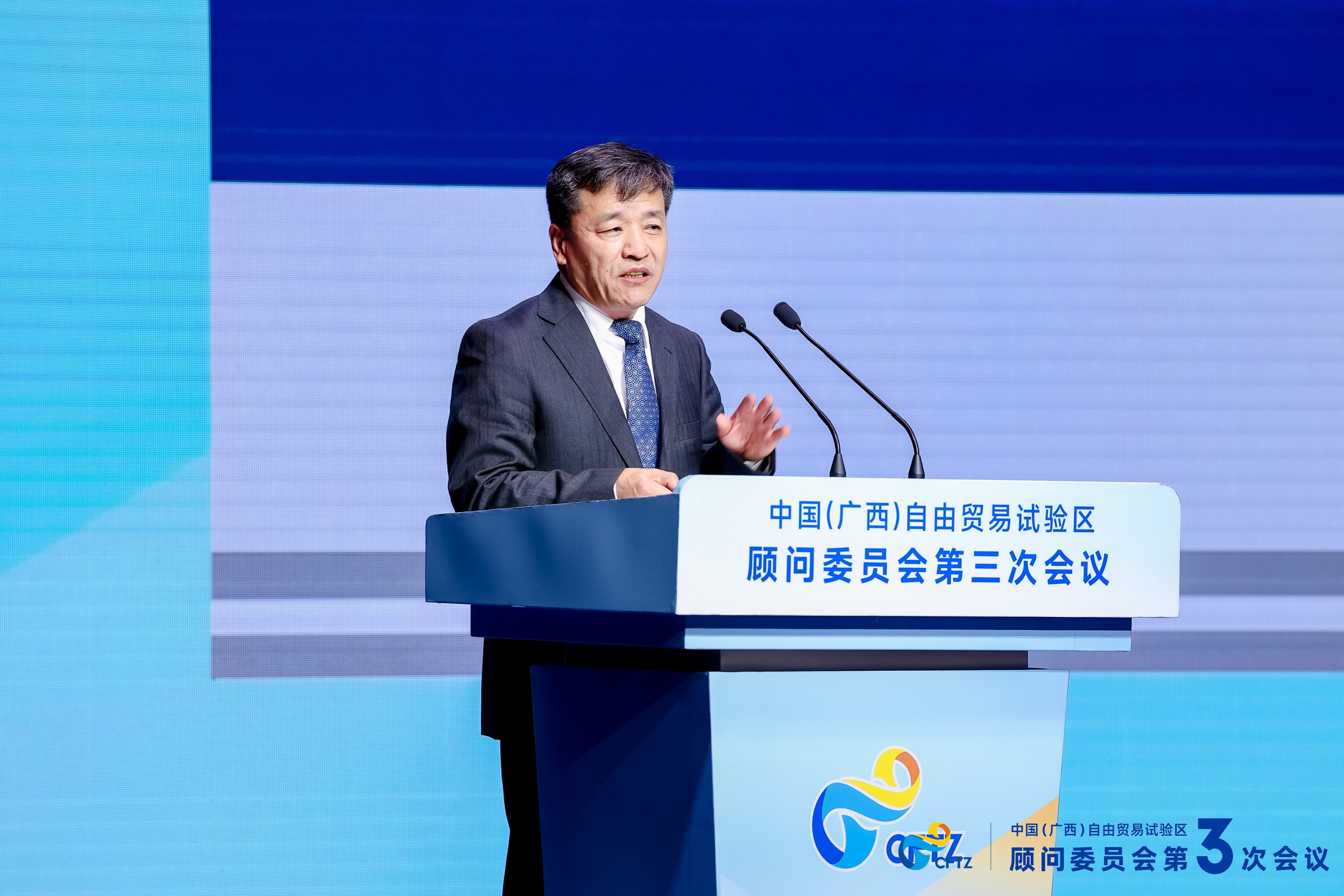 在专题发言环节,李光辉围绕第二届顾问委员会建言献策纲要,以“以制度型开放为引领,高质量建设广西自由贸易试验区”为题作专题发言。他从对接高标准规则、整合资源联动创新、跨境产业链集成创新、协同边疆模式创新四个方面对如何建设高质量自由贸试验区提出建议。