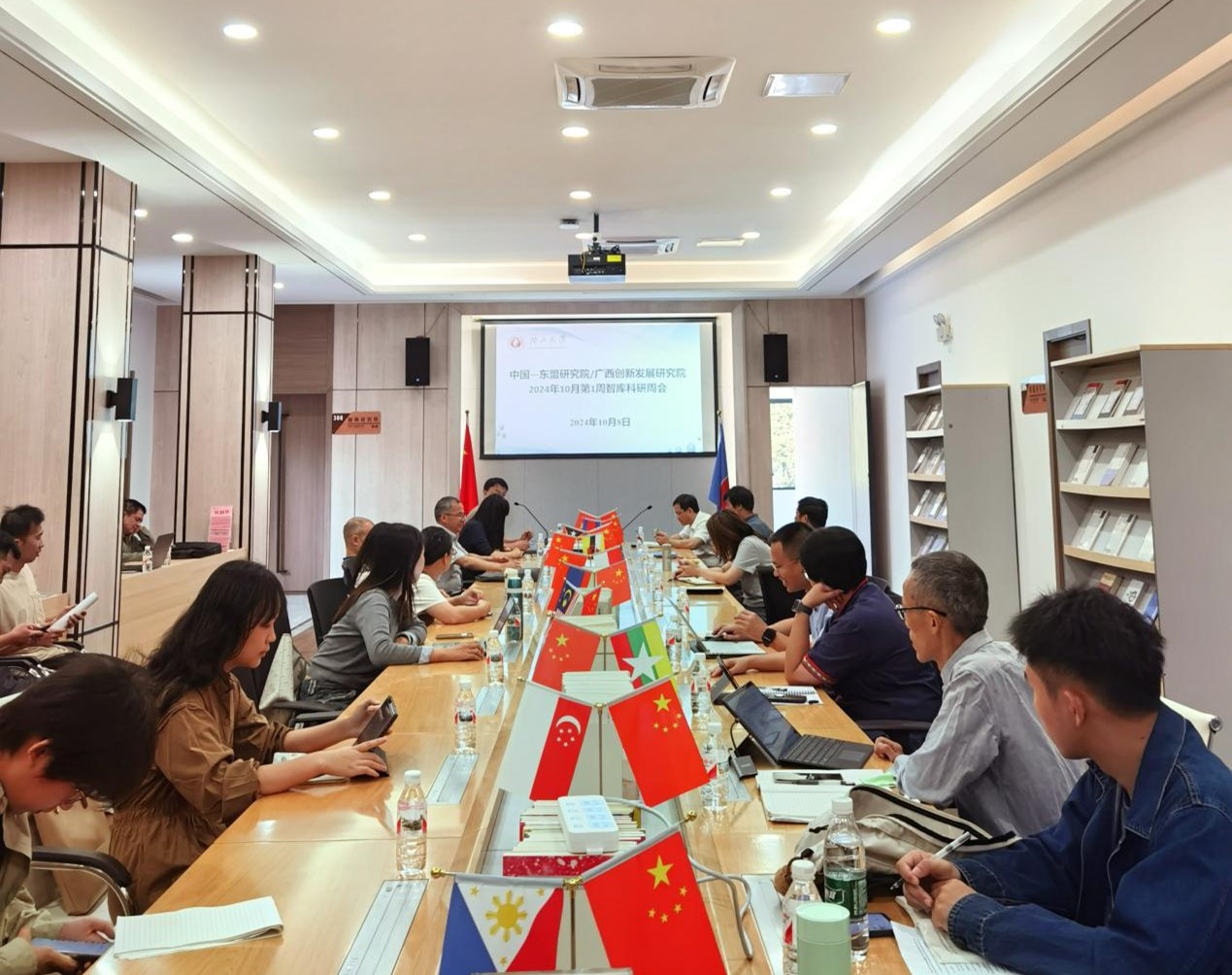 10月8日上午,我院在中国—东盟研究院三楼大厅召开10月第1周智库科研周会,由何政老师主持,全体智库科研人员参会。会上,我院智库科研人员根据时事跟踪任务分工,逐一汇报分享了2024年9月30日至10月6日国内、广西和东盟国家时事要闻、热点资讯信息。