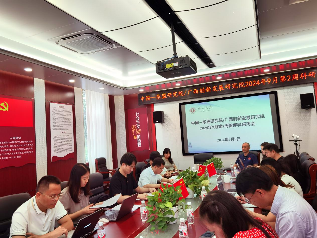 罗传钰副教授详细介绍了广西与越南合作重点关注领域,根据最新调研和相关数据解读了马来西亚经济向好的趋势分析情况。与会研究人员也逐一分享了9月2日至9月8日新加坡、老挝、越南等东盟国家的时事要闻和热点资讯,并围绕智库研究热点问题进行了深入交流探讨,形成了资政报告撰写的初步选题方向。
