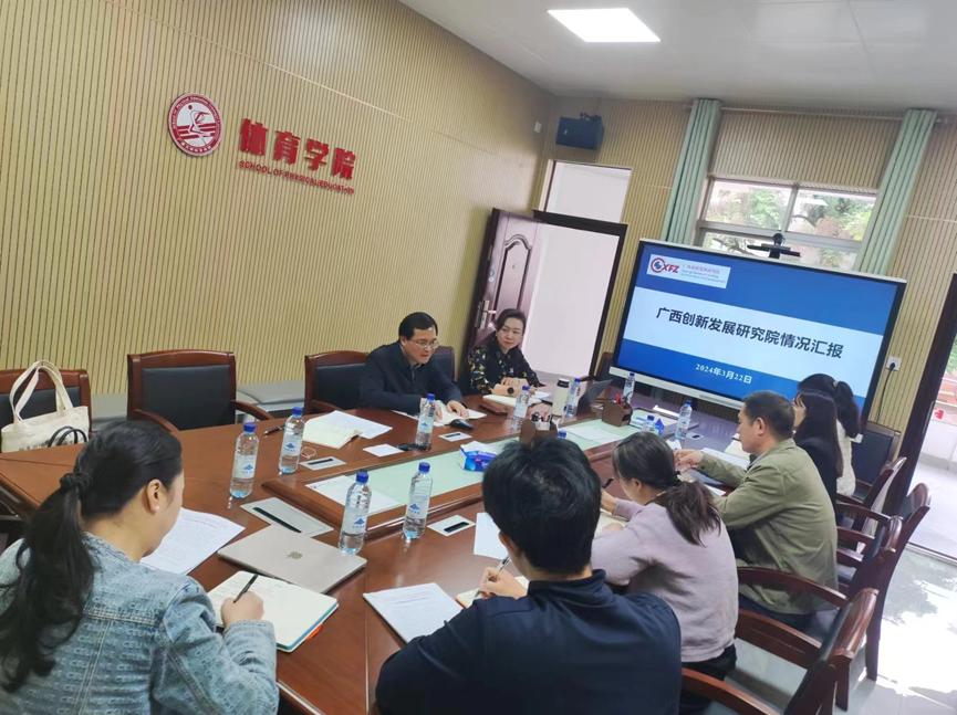 创发院执行院长梁运文阐述了体育决策咨询的重大意义和体育学院智库研究的巨大潜力空间,汇报了创发院成立背景和初衷、组织与运行框架、主要职责使命,介绍了创发院通过《创新发展研究》和《创新发展通讯》服务学院教师、二级学院和有关职能部门报送咨政报告、亮点工作的情况,并从服务体育学院教师通过《创新发展研究》报送咨政报告,服务学院通过《创新发展通讯》报送亮点工作,以专题汇报形式与与学院教师面对面交流智库研究心得、咨政报告写作技能,与学院专家合作开展体育教育、体育改革、体育对外交往、体育法治、广西体育产业发展等方面的智库研究提出合作事项。