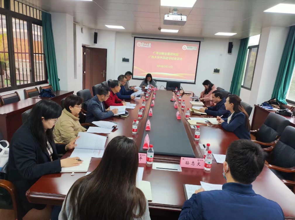 创发院执行院长梁运文汇报了创发院成立背景和初衷、组织与运行框架、主要职责使命,介绍了创发院通过《创新发展研究》和《创新发展通讯》服务学院教师、二级学院和有关职能部门报送咨政报告、亮点工作的情况,并从服务外国语学院教师通过《创新发展研究》报送咨政报告,服务学院通过《创新发展通讯》报送亮点工作,以专题汇报形式与与学院教师面对面交流智库研究心得、咨政报告写作技能,与学院专家合作开展东盟文献资料、面向东盟的公共外交、国家(广西)形象、东盟国家在桂历史遗迹资料整理与利用等方面提出合作事项。