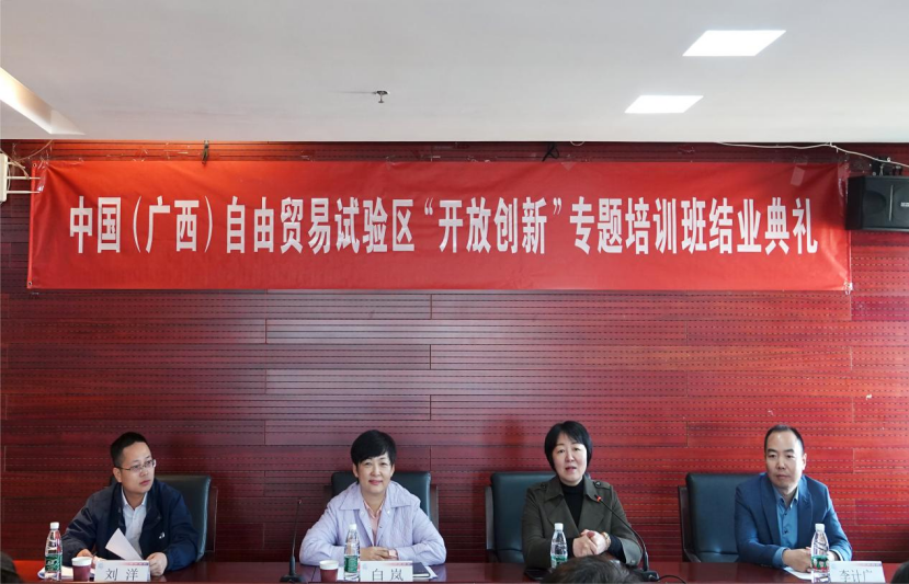 广西壮族自治区商务厅中国(广西)自由贸易试验区工作办公室专职副主任白岚、对外经济贸易大学国家对外开放研究院党委书记、国际经济研究院副院长庄芮、对外经济贸易大学国际商务战略研究院副院长李计广出席结业典礼并作讲话,广西壮族自治区商务厅自贸区制度创新处处长刘洋、中国(广西)自由贸易试验区研究院相关工作负责人出席。