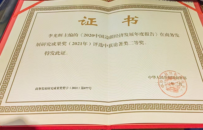 近日,由商务部组织的“商务发展研究成果奖”(2020-2021年度)评选结果揭晓,我院学术院长李光辉科研团队申报的成果《2020中国边疆经济发展年度报告》喜获论著类二等奖,开创了我院教师在该领域获奖的先河。