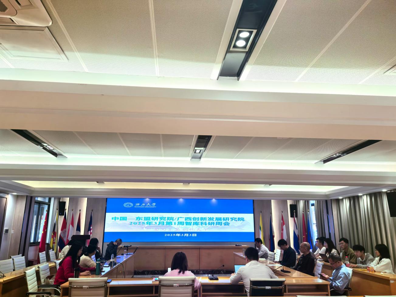 3月3日上午,我院在中国—东盟研究院国别研究楼101会议室召开2025年3月第1周智库科研周会,由孙硕副研究员主持,全体智库科研人员以及舆情研究助理参会。
