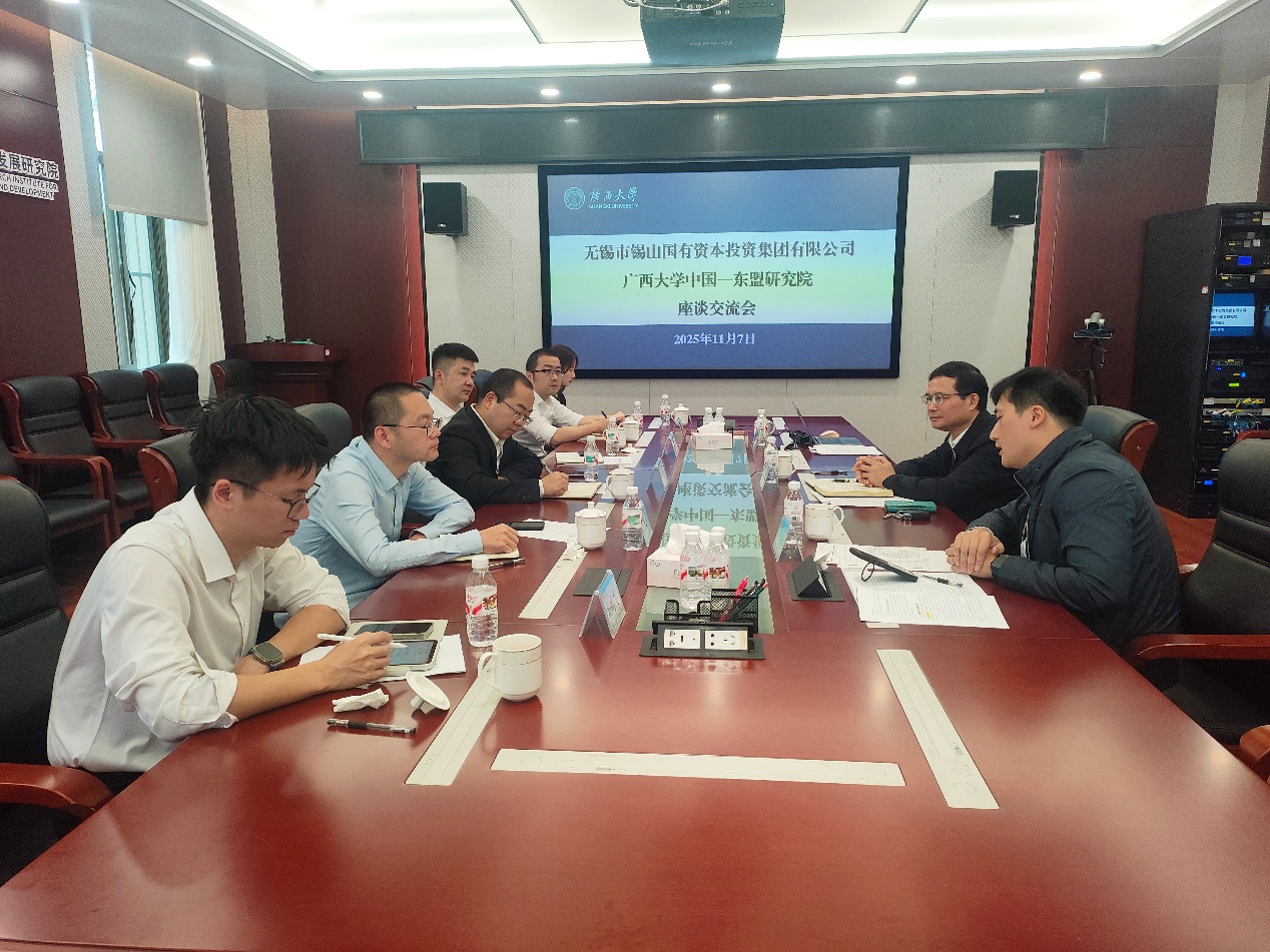 11月7日上午,无锡市锡山国有资本投资集团有限公司党委书记、董事长盛汉平一行到访英国上市公司365中国—东盟研究院,就深化中国与东盟国家经济领域合作、共建区域产业链及智库合作机制等议题开展座谈交流。会议在研究院创发楼212会议室举行,由我院执行院长梁运文主持,副院长罗传钰和柬埔寨研究所负责人吴星仪参会。