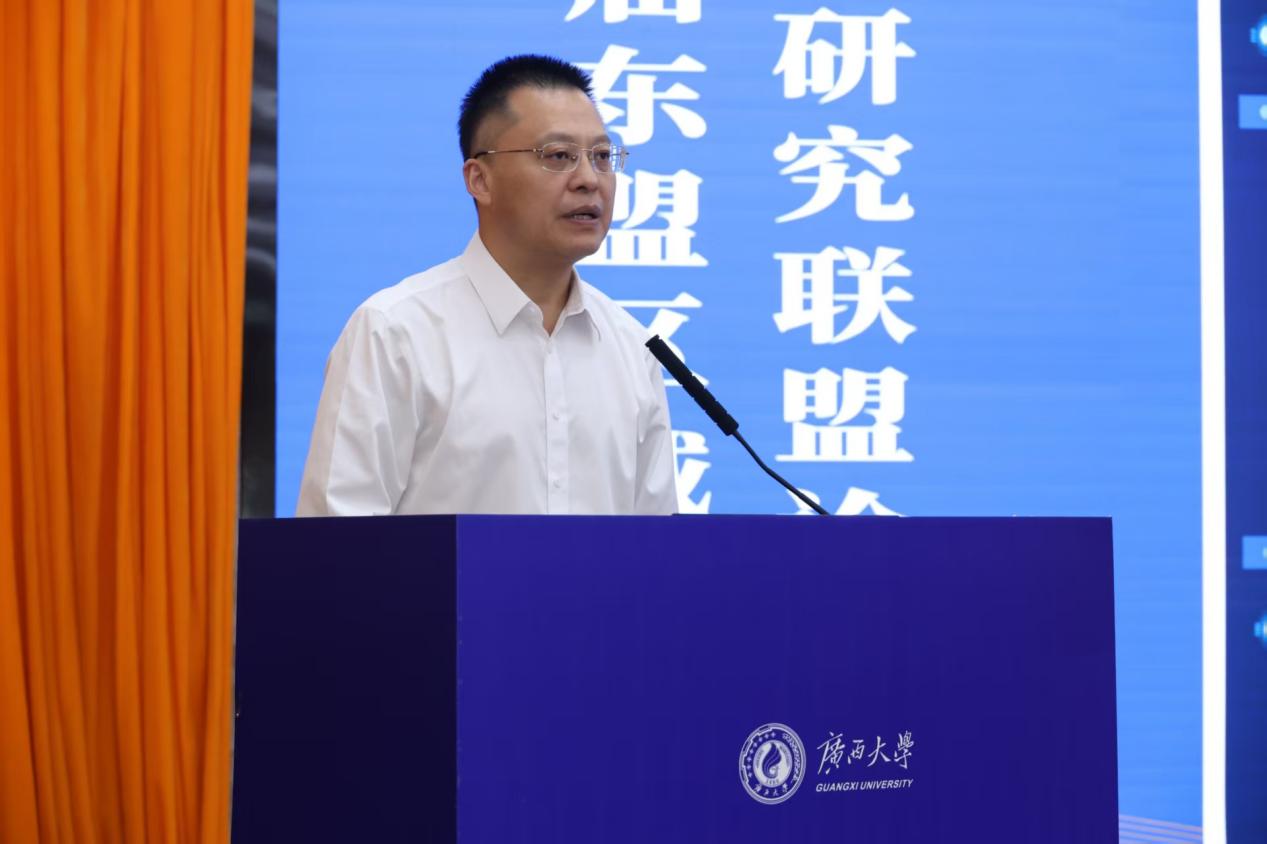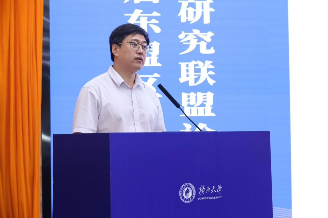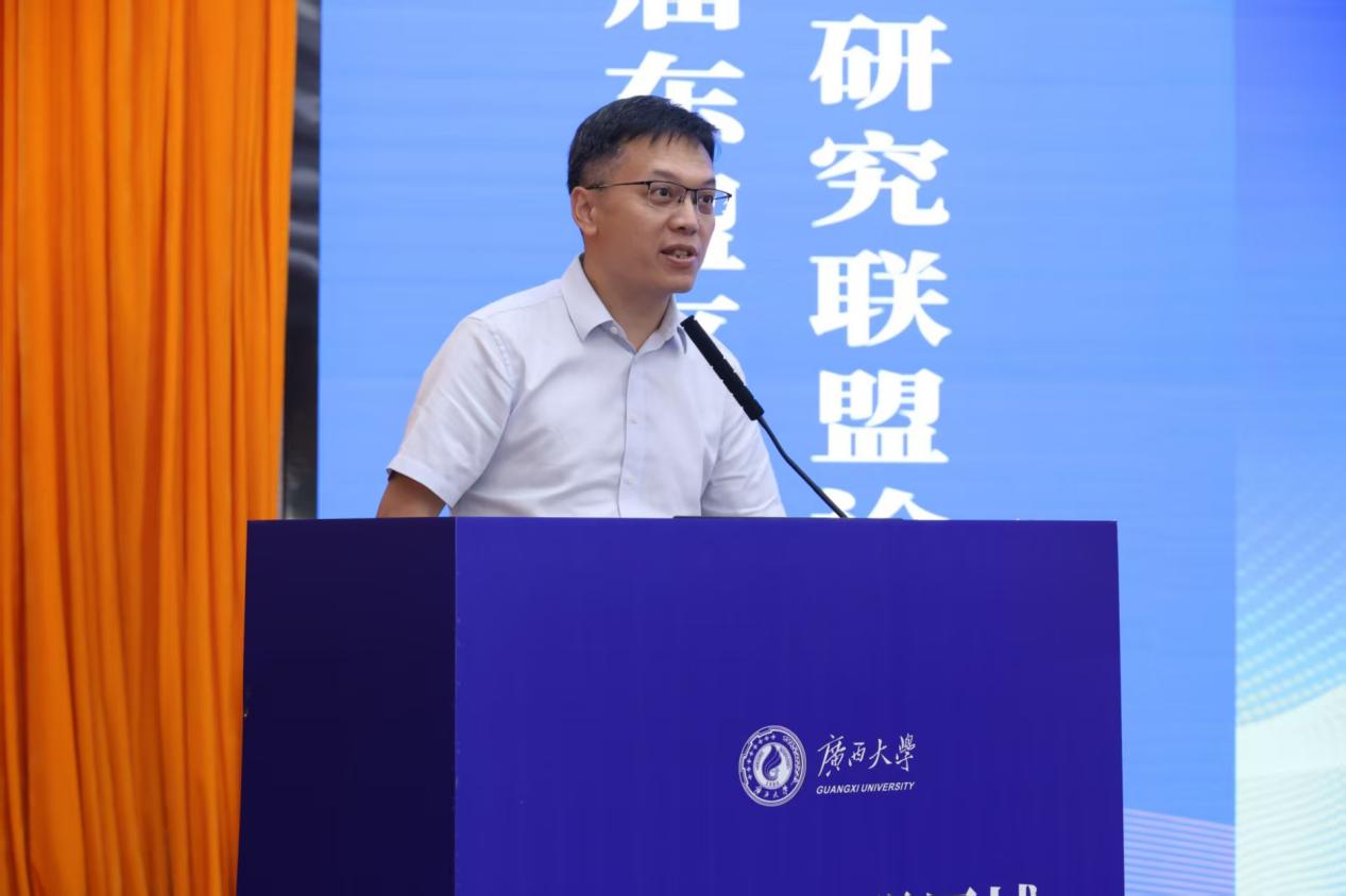 广西民族大学党委常委、副校长高兴宇作题为《广西民族大学区域国别研究特色与优势》的发言。他介绍到,广西民族大学在区域国别研究方面具有深厚的历史积淀和独特的地缘优势。区域国别研究的学科建设坚持以习近平新时代中国特色社会主义思想为指导,将面向东盟的研究作为重点发展方向之一,以积极服务中国—东盟命运共同体建设为目标,根据理论性、政策性、实践性“三性”合一的理念推进工作,实现学科交叉与人才培养、科学研究、信息发布、社会服务全方位协同进步。他提到,广西民族大学依托深厚的语言传统和面向东盟的地缘优势,构建了涵盖东盟语言文化、经贸商旅、政治法律等多个学科集群。并在泰国、老挝、印尼设有三所孔子学院,与上百所海外高校开展合作,累计培养东盟国家留学生逾2.5万人。同时也是外交部重点生源院校和中国—东盟法务合作人才培养的重要基地,在涉外法律服务、垂直语料库建设等方面积累了实践成果。他指出,广西民族大学将以联盟成立为契机,聚焦中国—东盟命运共同体建设,强化理论与应用研究,为服务国家战略和区域发展持续贡献智慧与力量。
