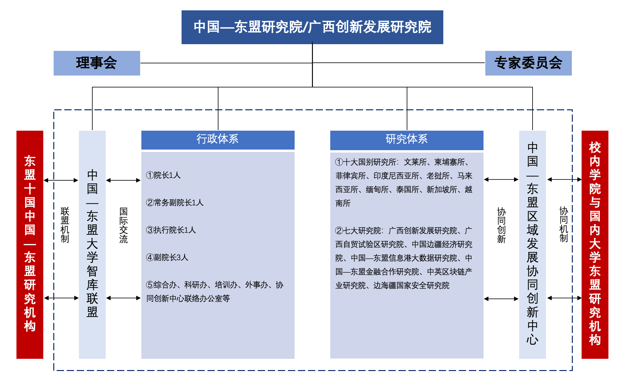 中国—东盟研究院组织架构与运行机制图 1. 理事会 理事会是中国-东盟研究院最高决策机构,宗旨是推进研究院与党委政府、社会各界和东盟国家的紧密合作,职责是对研究院的建设发展和重大事项进行决策。 2. 专家委员会 专家委员会是中国-东盟研究院重要的外脑资源,主要职责是参与研究院重大重点研究,指导研究院学术与智库研究,为中国-东盟合作和广西创新发展咨政建言。 3. 行政管理机构 研究院设立综合办、培训办、科研办、外事办和协同创新中心联络办公室等行政机构。 4. 研究机构 (1)十一大国别研究所:文莱、柬埔寨、印度尼西亚、老挝、马来西亚、缅甸、菲律宾、新加坡、泰国、东帝汶及越南所。 (2)七大研究院:广西创新发展研究院、中国(广西)自由贸易试验区研究院、中国边疆经济研究院、中国-东盟信息港大数据研究院、中国-东盟金融合作研究院、中英区块链产业研究院、边海疆国家安全研究院。 5. 科研平台 (1)中国-东盟区域发展协同创新中心。负责联系学校相关学院、国内大学东盟研究机构,为研究院提供协同创新支撑。 (2)中国-东盟大学智库联盟。负责组织举办中国-东盟大学智库联盟论坛,与东盟十国智库机构开展国际交流合作。 | |